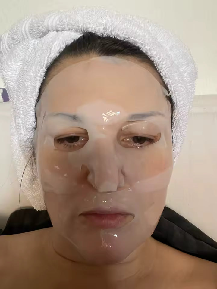 ¿Cómo funciona el cambio de color de la mascarilla?: Sí, una de sus características más innovadoras es que se aplica blanca y se vuelve transparente tras unas horas. Esto indica que el colágeno hidrolizado ha sido absorbido completamente por la piel, ayudando a refrescar el rostro, restaurar la hidratación perdida y aportar un brillo natural tipo 'glass skin'.